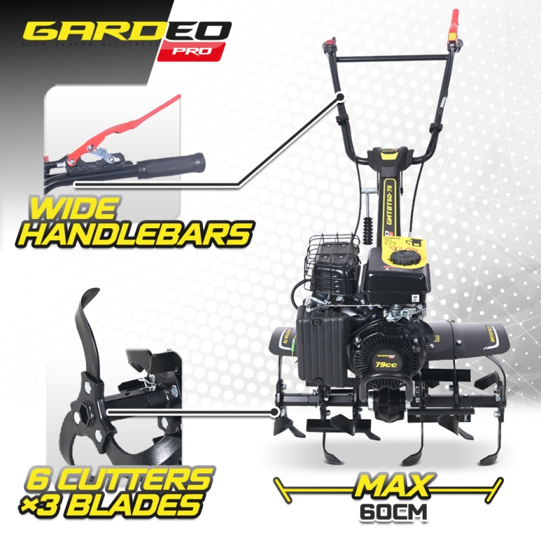 Ce motoculteur thermique de la marque Gardeo Pro est équipé d'un moteur Rato R80 de 79CC à axe horizontal. C'est un motoculteur professionnel conçu pour les agriculteurs et les paysagistes. Fabriqué avec des matériaux durables et fiables, il est idéal pour labourer les petites et moyennes parcelles, y compris les cultures, les potagers et les jardins jusqu'à 350m².